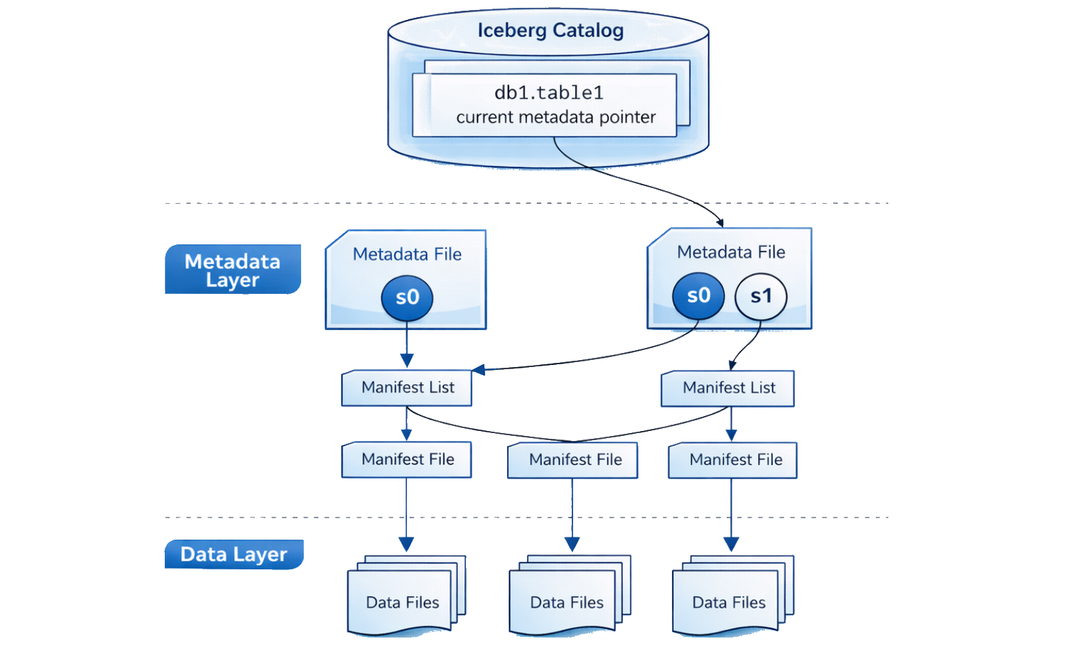 The architecture has three parts. Data files, usually Parquet, hold the actual rows. A metadata layer (manifest files and snapshots) tracks which files belong to which table and in what state. And a catalog keeps a pointer to the current snapshot, so any engine knows where to start reading.