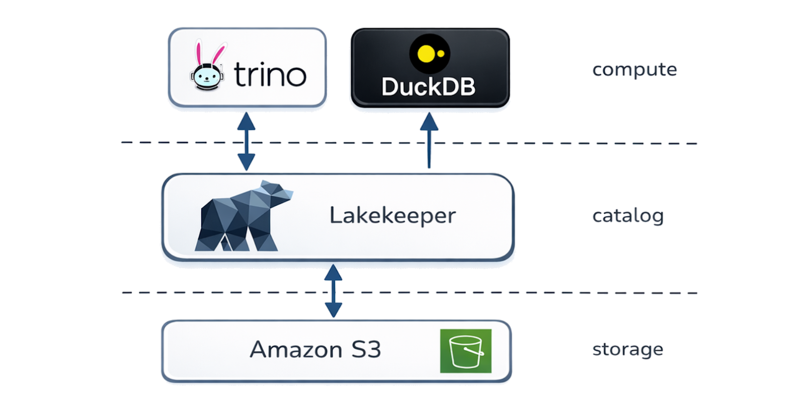 We landed on four components. S3 for storage. Lakekeeper as the Iceberg catalog. Trino for writes. DuckDB for reads.